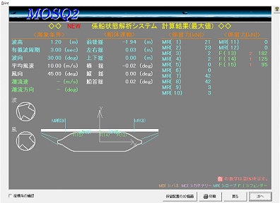 弊社では、岸壁に係留された船舶等の浮体が、波、風、潮流から複合外力を受けた時の、浮体の動揺、係留ラインの張力、防舷材の反力等を予測計算するシステムを開発しております。この計算システムの妥当性は、水槽実験等で確認されており、この解析結果はすでに数多くの係留システムの設計に適用されております。