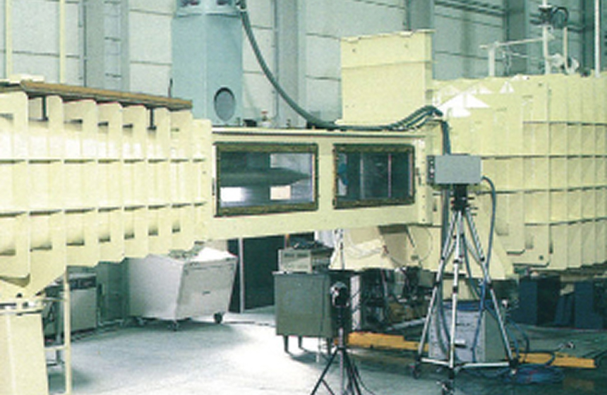 大水槽に比べて規模が小さい水槽ですが、基礎的研究用としても使いやすい水槽になっています。また水深を変えて浅水時の諸試験ができます。
