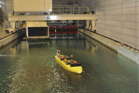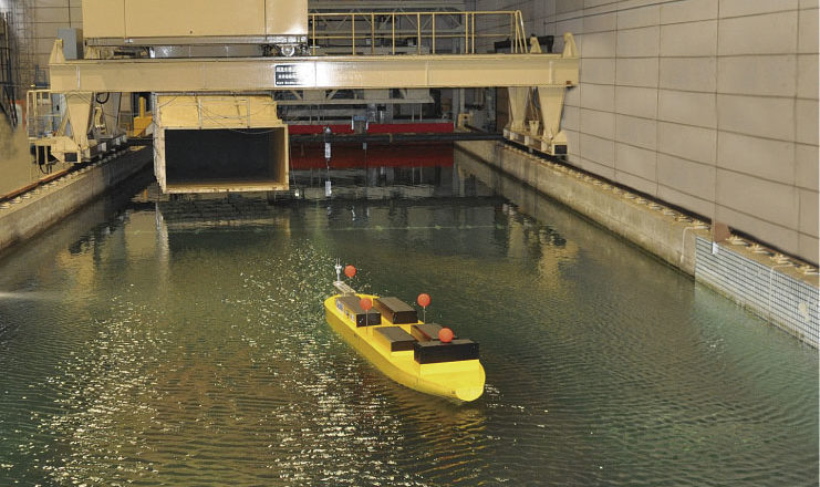 タレット係留等の一点係留システムでは、風や潮流により、振れ回り運動が生じます。波、風、潮流中において、係留された浮体の振れ回りを含む運動や係留性能を確認する試験です。