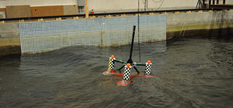 浮体式の石油・ガスプラットフォーム、洋上風力発電等の海洋構造物に対する、波、風、潮流中での運動及び係留性能を確認する試験です。海洋構造物に対する、浮体・係留の検討はもちろん、えい航や設置工事の安全性等を模型試験により確認することができます。