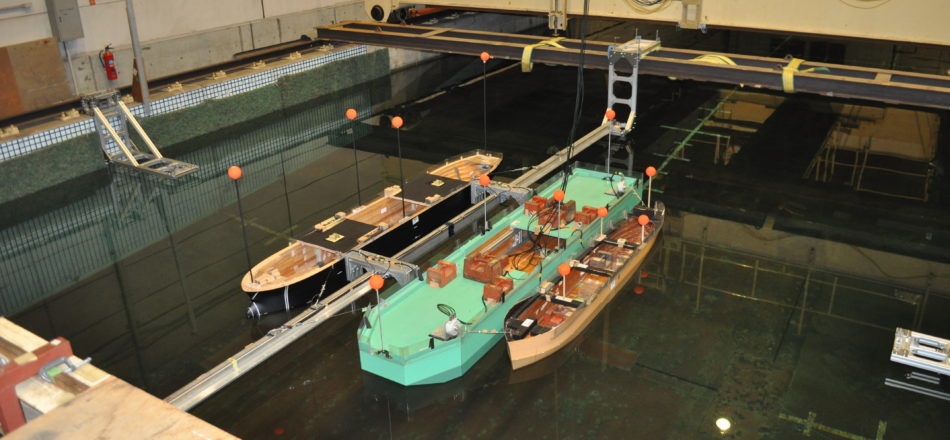 近年、FSU/FSRUの需要拡大により、2隻以上の浮体が近接係留され、荷役する方式が検討されています。このように近接係留された多浮体の動揺問題に対して、水槽試験により浮体の安全性や係留索、防舷材に作用する荷重を計測することができます。