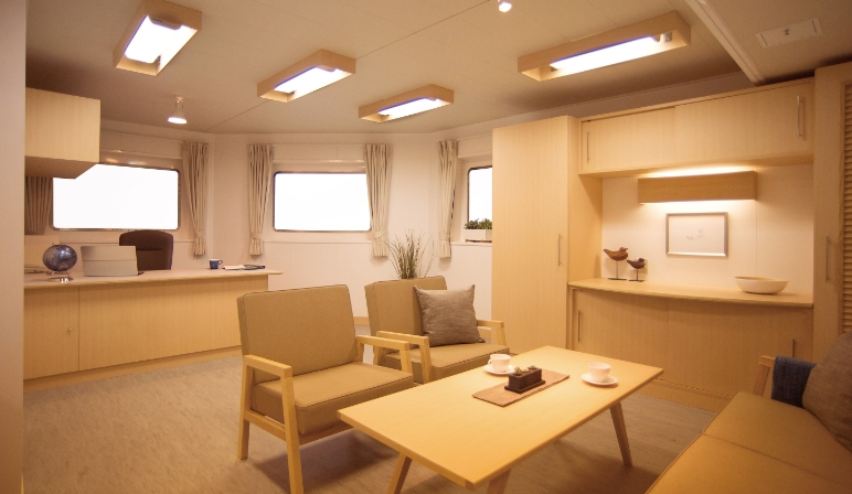- 独创的室内装饰概念 “NEXT STYLE”,利用精致的住宿设计和间接照明,为船员提供安心舒适的居住环境。