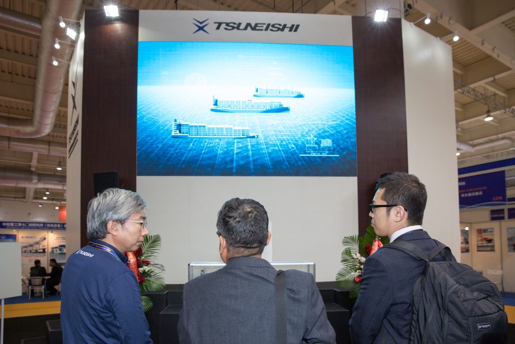 在“SHIPTEC CHINA 2016”的展厅内,常石舟山介绍了为应对多种市场需求而开发的2800TEU集装箱运输船、LR(Large Range I)型成品油轮、以及为扩大造船种类正在建设中的牲畜运输船。