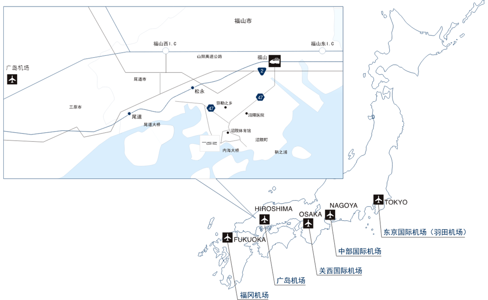 - 从广岛机场乘坐机场高速巴士到福山站约40分钟。