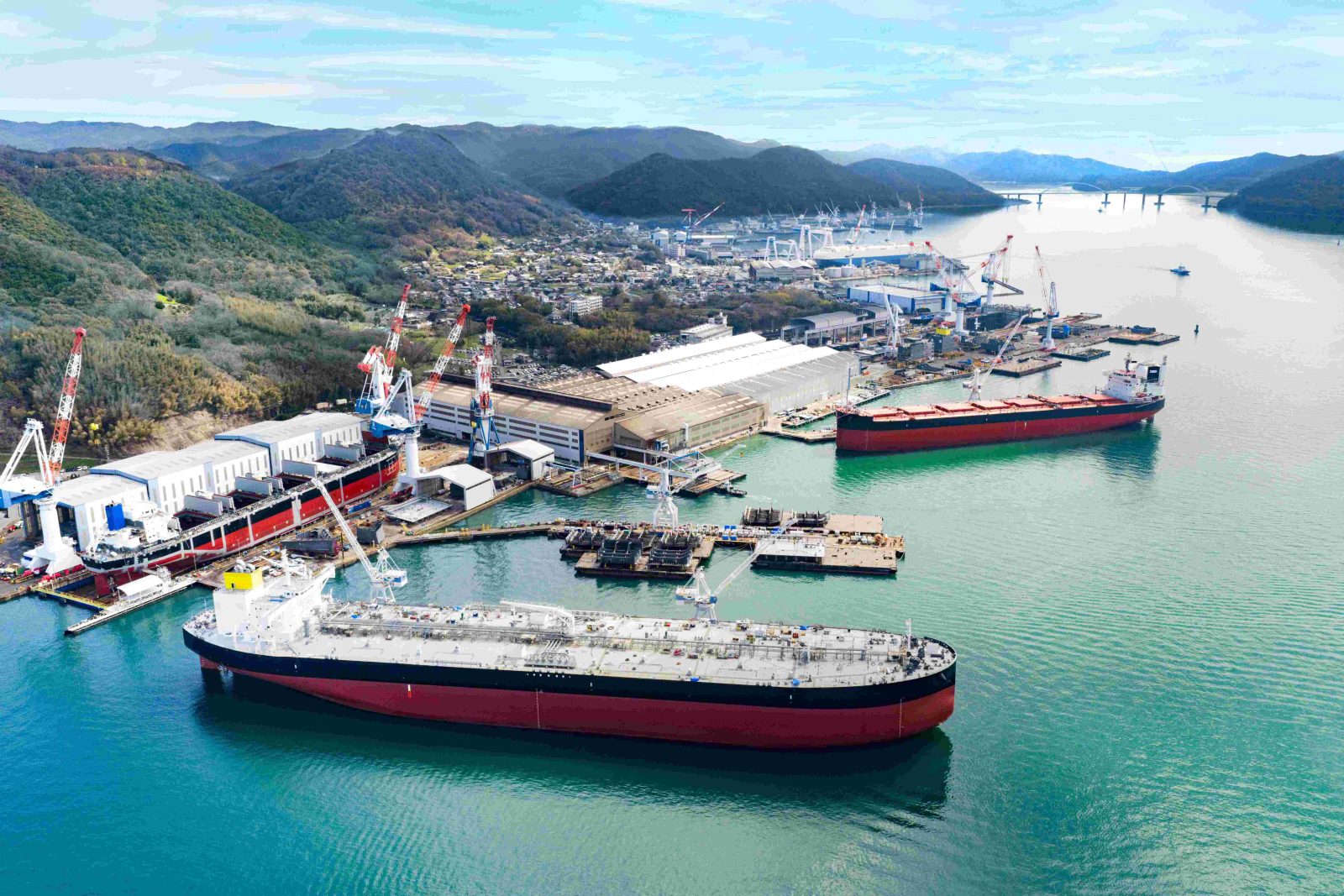 Located in Tsuneishi, Numakuma-cho, Fukuyama-shi, a city facing the Seto Inland Sea in the eastern part of Hiroshima Prefecture. The new ship building division is equipped with one dock and one berth for shipbuilding. The adjacent repair factory, having 4 docks exclusively for repair and 7 repair wharves, can dock vessels of up to 200,000-DWT. Undertaking not only periodical inspection and ordinary repair work but also large-scale modification and ballast water management system retrofit work, we support the safe operation of ships.