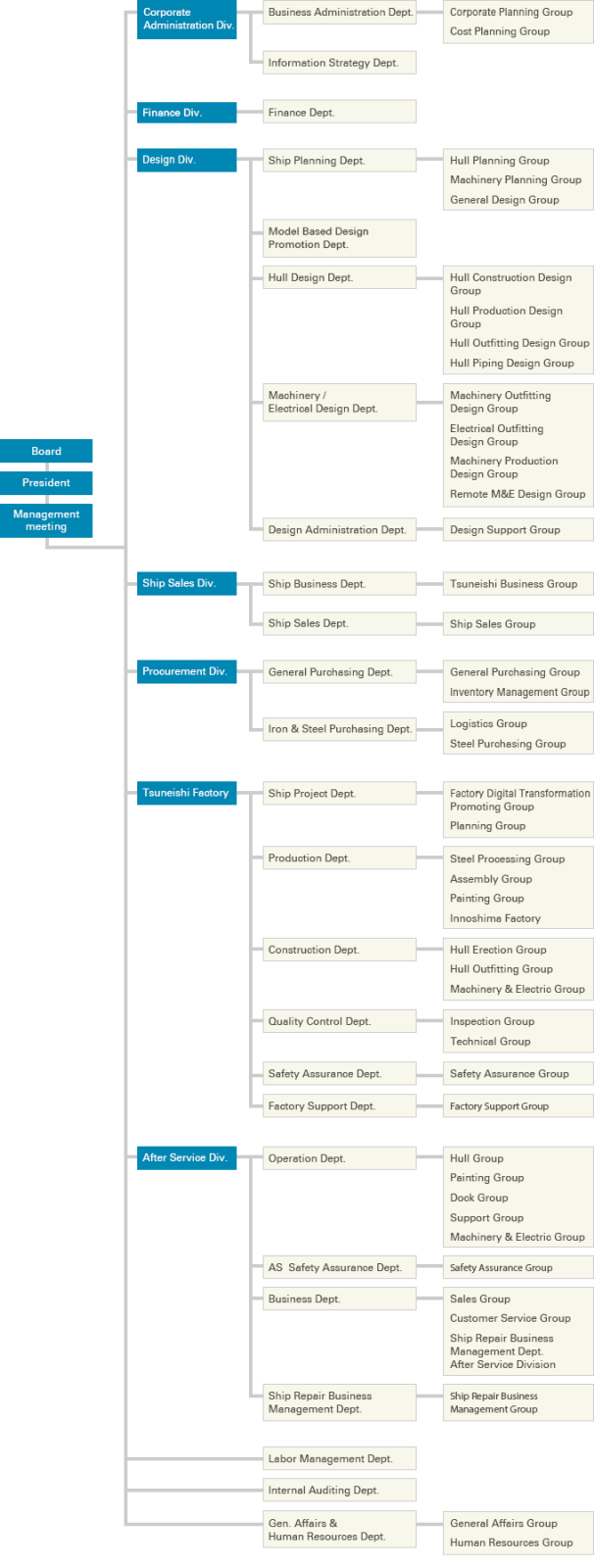 News All Press release Topics Products Products TOP WIDE KAMSARMAX KAMSARMAX TESS66 AEROLINE TESS64 AEROLINE TESS42 LRI Product Oil/Chemical Tanker 1,091TEU Type Container Carrier 2,806TEU Type Container Carrier (Gearless) 2,806TEU Type Container Carrier (Geared) 1,944TEU Type Container Carrier Cruise Ship Service Technology Technology TOP Cutting-edgetechnologies of new ships Repair Service Company Corporate info TOP Greetings Corporate Profile Phiposophy Executives History Oraganizational Chart Factory Access Map Recruit Recruit Info(JP) Graduate rectuitment(JP) Mid-career recruitment(JP) Sustainability Sustainability Message Ingenuity for Global Environmental Conservation Trust Building with the Community Pursuit of Happiness in the Workplace Contribution in Technology and Development Contact Privacy Policy Site Map TOPCorporateOrganizational Chart Organizational Chart Return to Corporate