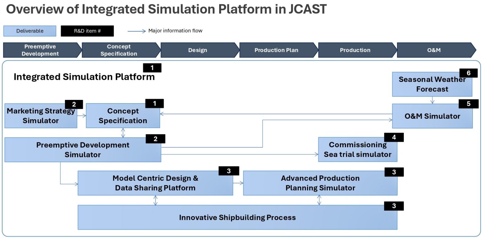 Based on the components of the Integrated Simulation Platform, research and development will be promoted across six R&D items. In 2028, an interim evaluation including a stage-gate assessments will be conducted, and by 2030, the deliverables from each R&D topic will be integrated into the Integrated Simulation Platform (see diagram below), aiming for its demonstration in the design and construction of actual ships.