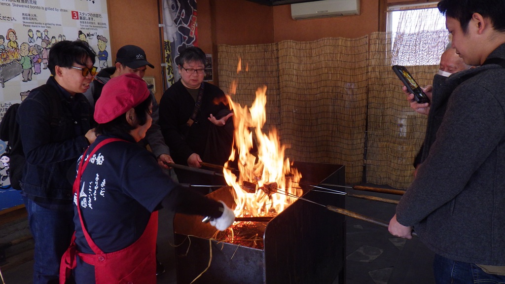 The programme began with a visit to the Tosa Tataki Dojo, where participants experienced the traditional straw-grilling technique used to prepare katsuo (bonito). Using bundles of straw, they grilled the fish themselves before enjoying freshly prepared katsuo tataki. The hands-on experience offered an authentic introduction to Kochi’s local food culture.