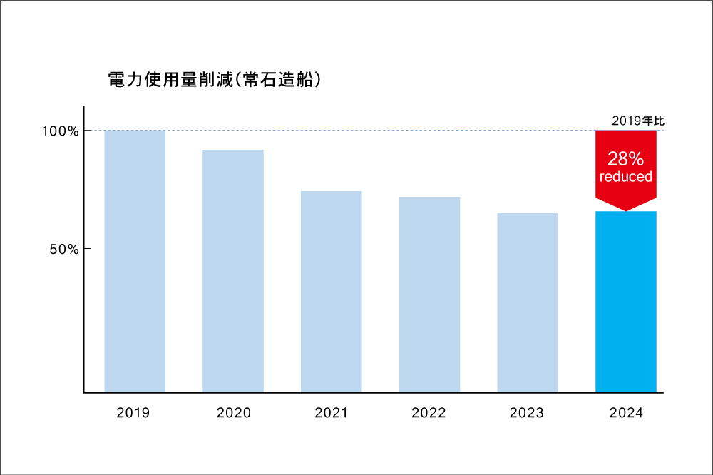 常石造船グループでは、GHG(温室効果ガス)削減と循環型社会の構築に向けて使用電力量の削減に取組んでおります。工場における生産プロセスを見直し、エネルギー消費が少ない船造りを実現して参ります。