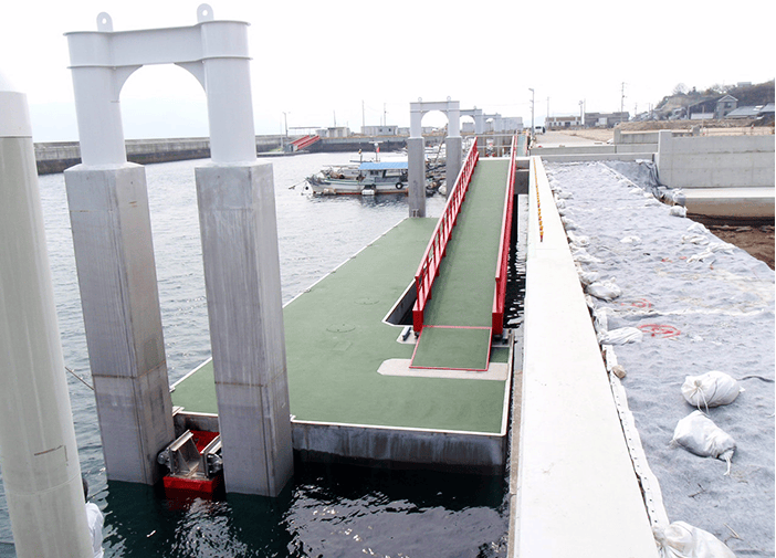 建設業では、橋梁の製作・架設工事を主とし、中でも、海上輸送を必要とする浮桟橋・渡橋の製作・架設を得意としています。また、長年培ってきた経験と設計技術を活かし、既設橋梁の維持補修・耐震補強工事にも力を入れています。
