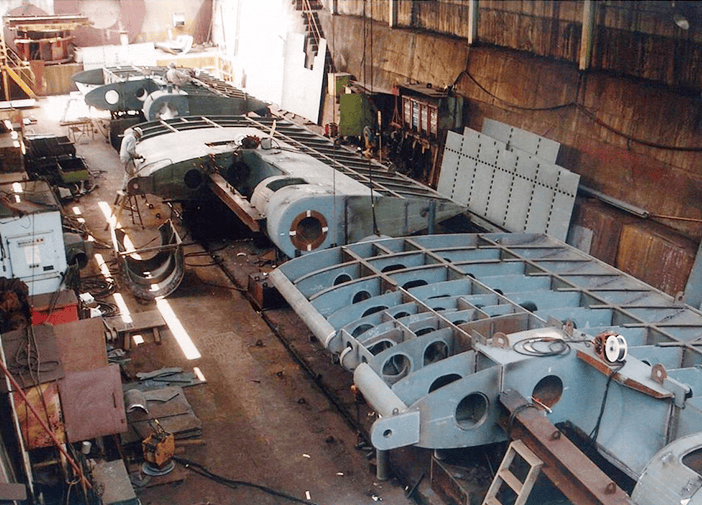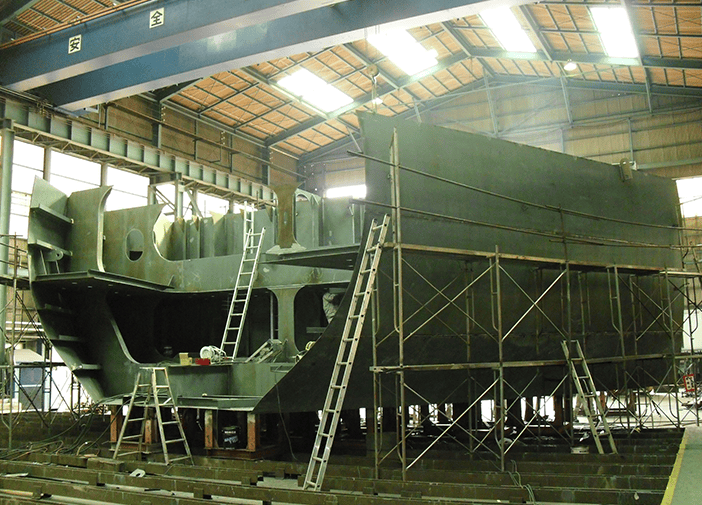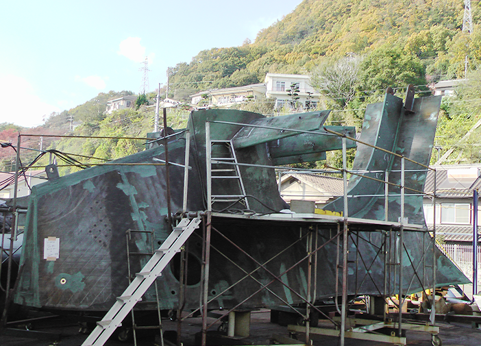舵構造製作では、特許認証の舵ボーリングの専用機を開発し、高精度・高品質を実現しました。