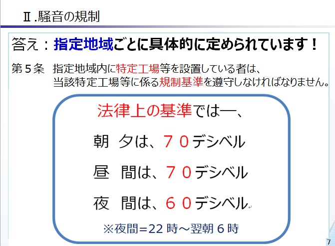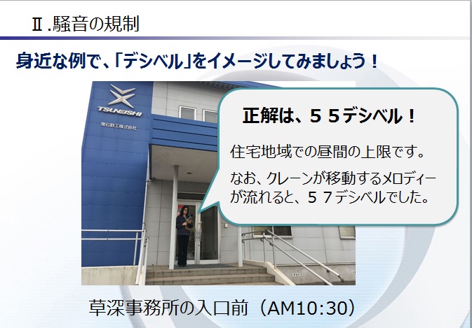 セミナーでは、全国および福山市における騒音の状況を把握したうえで、法律で定められている騒音規制の基準値を再確認しました。また、常石鉄工の事務所や工場の近隣で音の大きさ(デシベル)を計測した調査結果が報告され、実際に発生している音のレベルを共有しました。さらに、騒音は「感覚公害」と呼ばれており、単に法律で定められている騒音規制を順守するだけでなく、近隣住民とのコミュニケーションが重要であり、夜間等にやむを得ず工場を稼動する場合には事前に説明や協力依頼をするなどして、近隣住民と良好な関係を築くことが大切だと説明がありました。