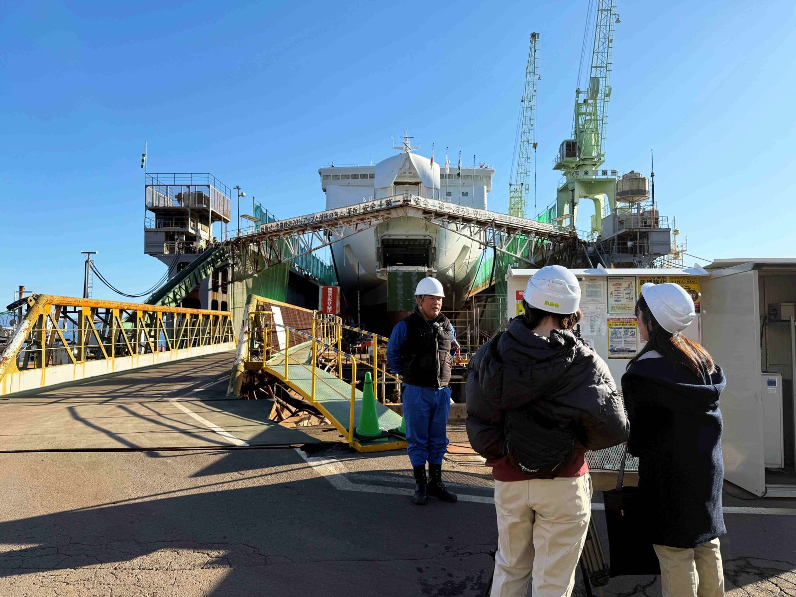 常石呉ドック川尻工場にて、株式会社商船三井さんふらわあのフェリー「さんふらわあ ぱーる」を取り扱うテレビ番組の撮影取材がおこなわれ、12月15日MBS毎日放送「よんチャンTV」の特集コーナーで放送されました。 番組では、船底やメンテナンス風景など、普段はなかなか見ることができないドックでの作業が紹介されました。