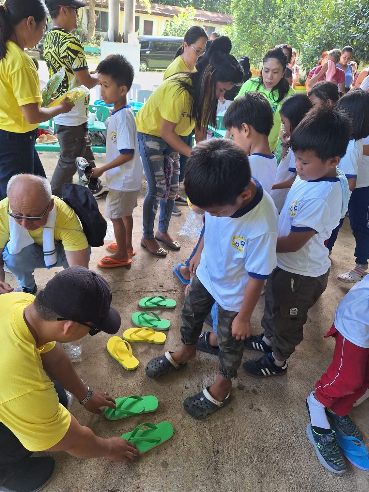当日は、THIをはじめフィリピンに拠点がある常石グループ各社から約50名のボランティア社員が参加し、児童347名(幼稚園〜小学校6年生)にカラフルなサンダルを配布しました。 会場では子どもたちによるゲームやリレーも行われ、社員ボランティアからは温かいおかゆが振る舞われました。また、ゲームで勝った子どもたちに渡されたぬいぐるみは、日本本社が展開する「SMILE BOX」活動*を通じて寄贈されたもので、社員の想いが詰まった贈り物です。