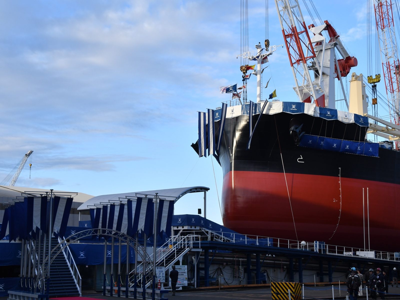 News すべてのニュース プレスリリース トピックス Products 製品情報トップ WIDE KAMSARMAX KAMSARMAX TESS66 AEROLINE TESS64 AEROLINE TESS42 LRI Product Oil/Chemical Tanker 1,091TEU Type Container Carrier 2,806TEU Type Container Carrier (Gearless) 2,806TEU Type Container Carrier (Geared) 1,944TEU Type Container Carrier Cruise Ship Service Technology 技術情報トップ 新造船の新技術 修繕サービス Company 企業情報トップ 社長挨拶 会社概要 企業理念 役員 沿革 組織図 拠点一覧 地図・アクセス Recruit 採用トップ 新卒採用 キャリア採用 障がい者採用 Sustainability サステナビリティ メッセージ 地球環境保全への工夫 地域・社会との信頼づくり はたらく喜びの追求 開発・技術での貢献 お問い合わせ プライバシーポリシー サイトマップ 2025/11/07 常石造船企業動向製品 常石造船 42,200トン級ばら積み貨物船の命名進水式を実施 進水を待つばら積み貨物船 常石造船は、11月6日(木)に常石工場第一船台で、42,200トン級ばら積み貨物船の命名進水式を行いました。本船は「PAIWAN DIAMOND(パイワン・ダイアモンド)」と命名され、巨大な船体が轟音を響かせながら海へと滑り込む進水の瞬間には、来賓および関係者から歓声と拍手が沸き起こりました。 無事に進水を終えた本船は、常石工場内の岸壁に移動され、残る艤装工程を行います。 進水の瞬間 無事に進水した船舶
