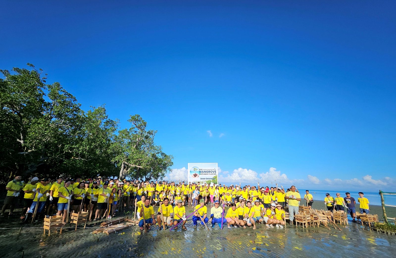 当日は、フィリピン拠点のグループ各社の従業員、現地ボランティア団体、地元バランガイ職員ら計278名が参加し、干潮の時間帯にあわせて午前7時30分から植樹を開始しました。当日は快晴に恵まれ、参加者は泥に足を取られながらも協力して作業を進め、沿岸環境の保全に汗を流しました。