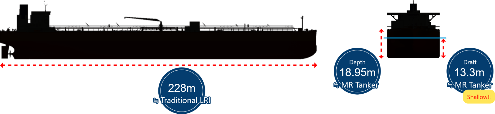 - 船幅を38mとし、深さ・喫水を浅くすることで、MR型と同等のエアドラフトやマニホールドの高さを実現。