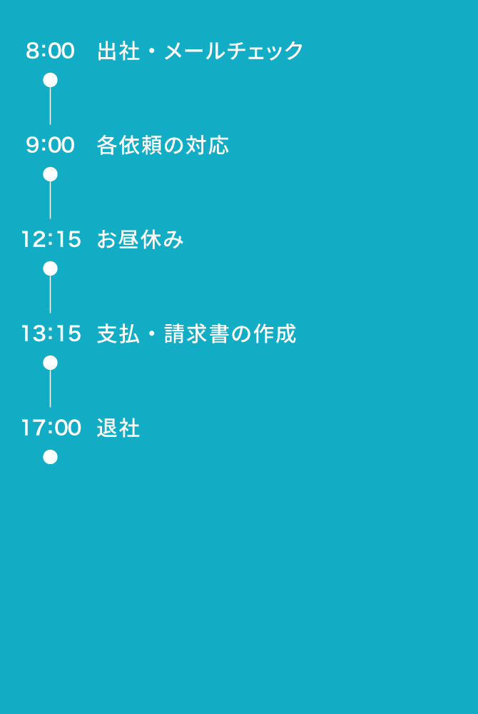 総務の役割は多岐にわたり、会社全体の円滑な運営を支えています。会社の窓口としての機能を果たすだけでなく、事務所・寮・社宅の管理や国内赴任者や海外赴任者の手続きなど、様々な業務に携わっています。これらの業務は直接的に会社の利益に関わるものではありませんが、社内の多くの人のサポートができる仕事です。
