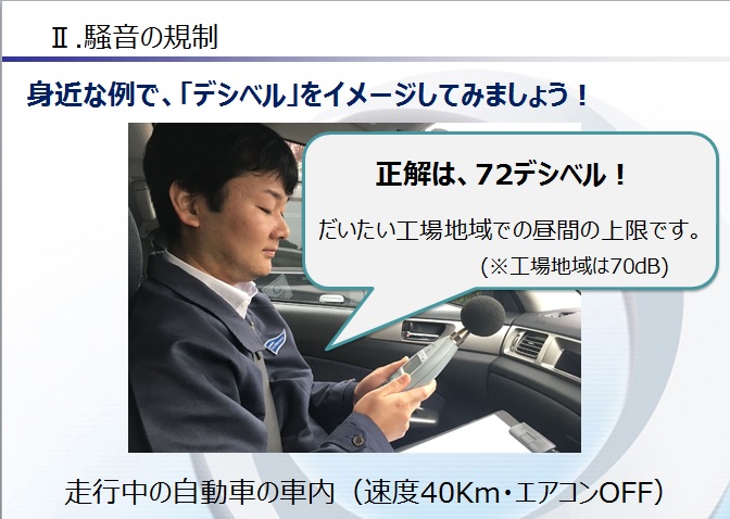 セミナーでは、全国および福山市における騒音の状況を把握したうえで、法律で定められている騒音規制の基準値を再確認しました。また、常石鉄工の事務所や工場の近隣で音の大きさ(デシベル)を計測した調査結果が報告され、実際に発生している音のレベルを共有しました。さらに、騒音は「感覚公害」と呼ばれており、単に法律で定められている騒音規制を順守するだけでなく、近隣住民とのコミュニケーションが重要であり、夜間等にやむを得ず工場を稼動する場合には事前に説明や協力依頼をするなどして、近隣住民と良好な関係を築くことが大切だと説明がありました。