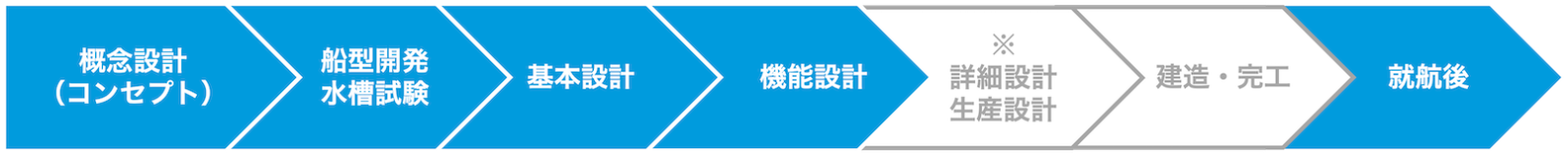 ・ 次世代船の設計、開発の補助、技術的な支援、提案を上記フロー内の概念設計から機能設計のフェーズまでサポートいたします。