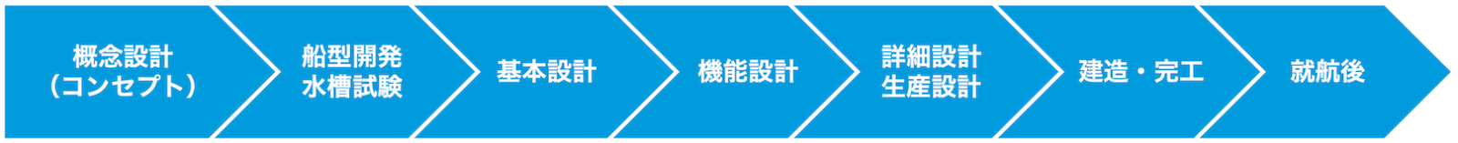 各船種の仕様決定におけるマーケット調査に始まり承認図作成に至るまで、上記フローに沿ってお客様のご要望に合わせた船舶の開発・設計を一貫して請け負います。また船型開発、強度・振動解析など、各フローにおける部分的な設計支援も実施いたします。