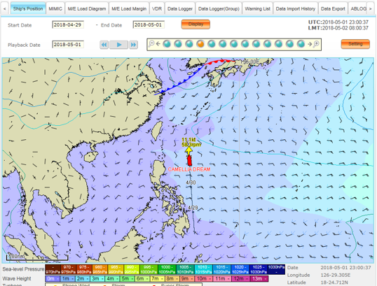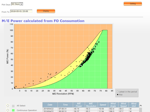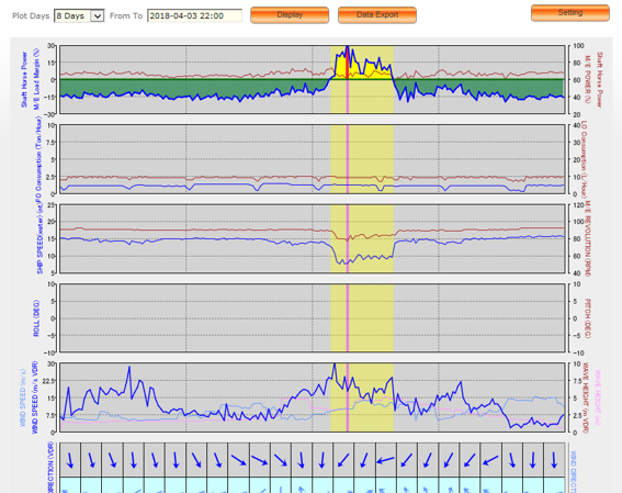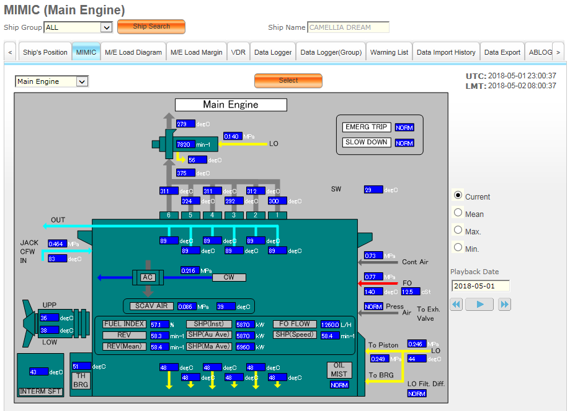 「Fleet Monitor」は船上に設置したVDRまたは機関データロガーにて毎分の船舶データ(瞬時値)を収集し、最大90日までのデータを保存・閲覧可能なシステムです。また、衛星通信を経由して弊社運営のポータルサイトにデータを送信し、お客様はインターネット経由で自社船舶の運航データをいつでも下記のような画面で参照可能です。