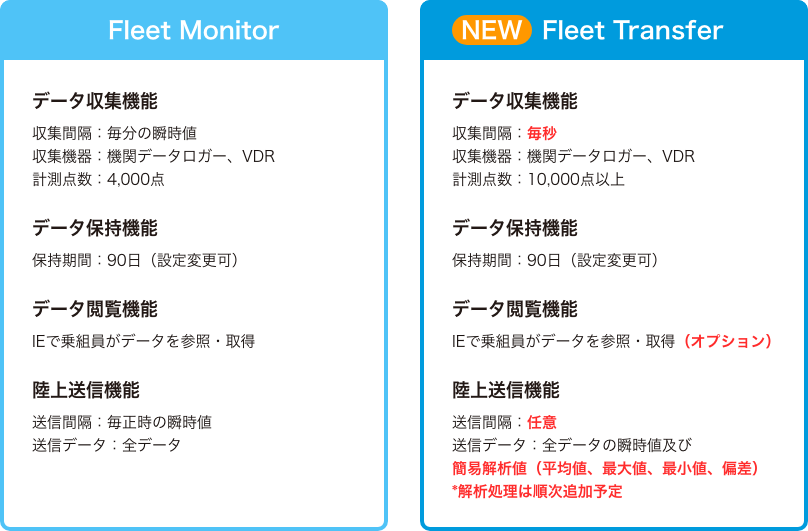 更に「Fleet Monitor」のほかにも下記のように機能強化した、「Fleet Transfer」も新たに開発し、販売しています。「Fleet Transfer」は船舶の非常に詳細なデータを収集し、陸上に送信することで、陸上側での就航解析等のサービスに活用可能なシステムとなっています。