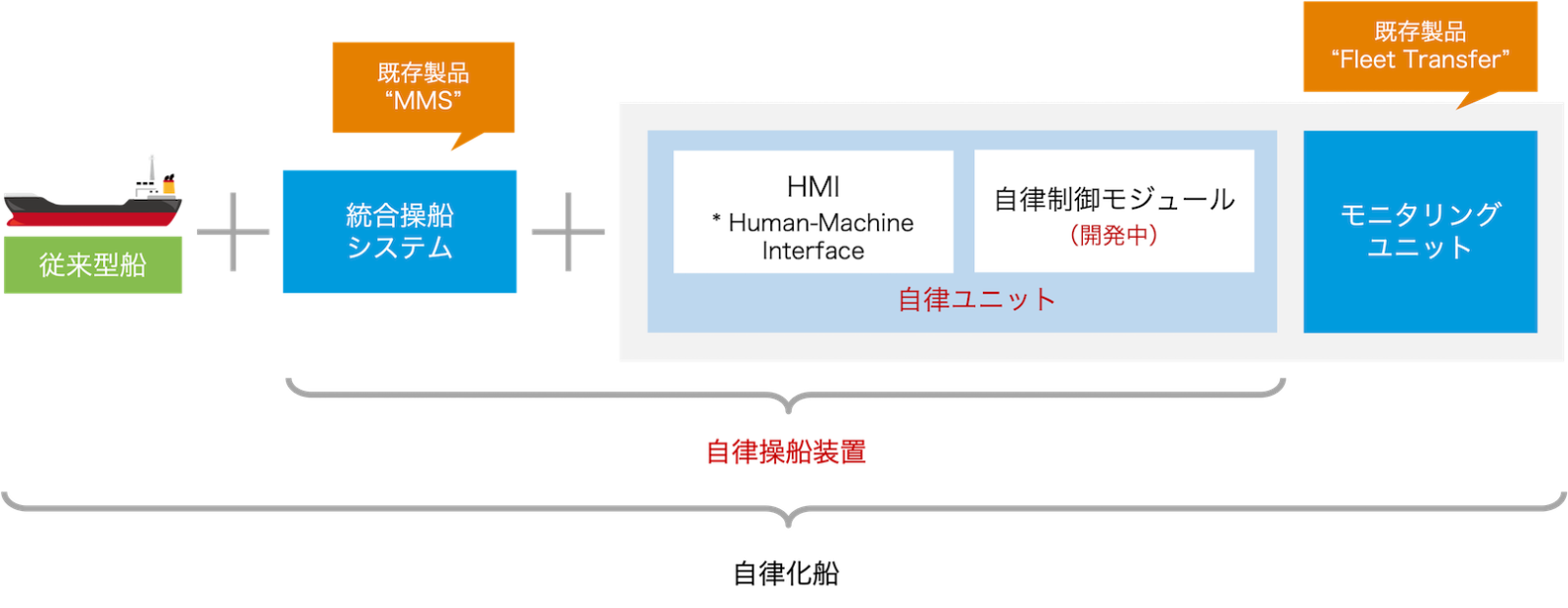 『自律操船装置』はモニタリングユニットであるFleet Transfer、統合操船装置であるMMSと現在開発中である自律ユニットで構成されます。