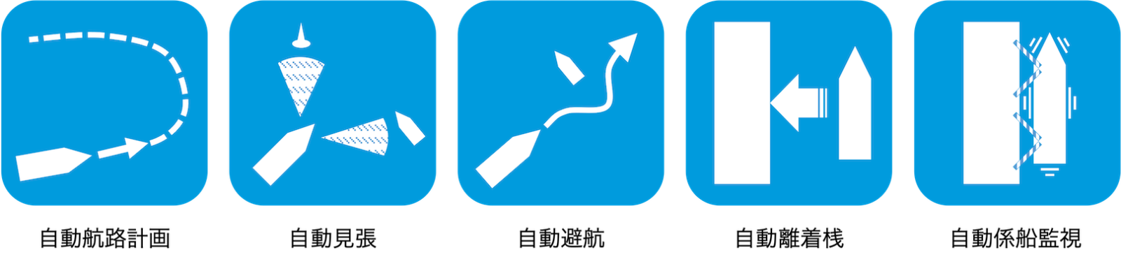 今後リリースする自律化機能としては『自動経路航路計画』『自動見張』『自動避航』『自動離着桟』『自動係船監視』を予定しております。