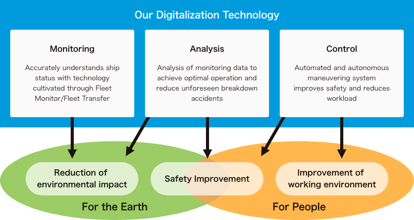 We will contribute to “reduction of environmental impact”, “improvement of safety” and “improvement of working environment” in ship operation through digitalization technology.