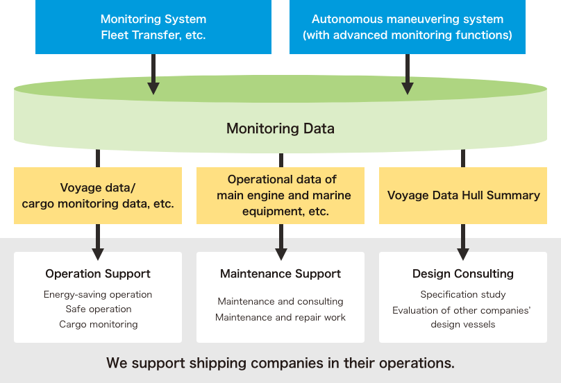 We aim to provide services and products that can realize energy-saving operation, safe operation, and cargo management by utilizing maneuvering system and monitoring data from Fleet Monitor and Fleet Transfer.