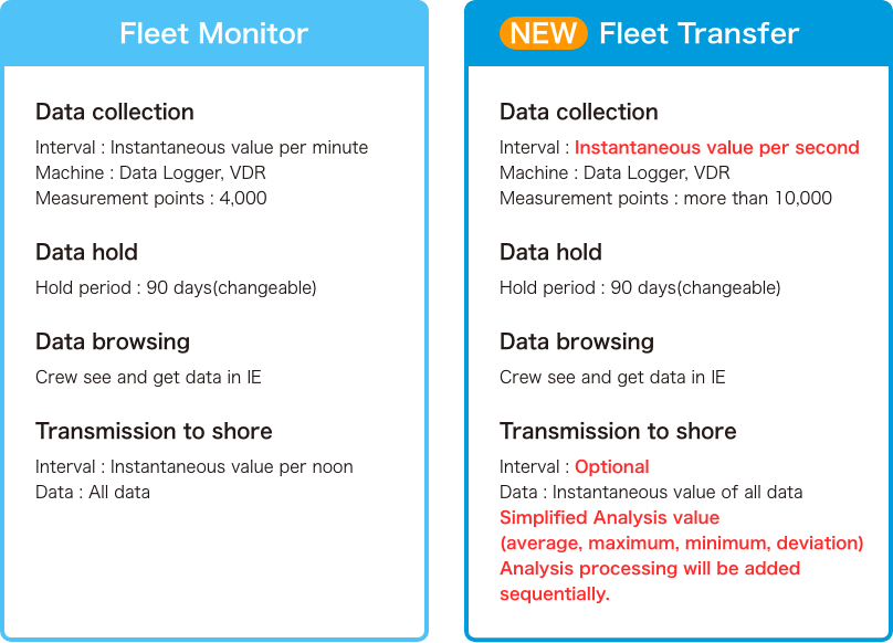 In addition to Fleet Monitor, we have also developed Fleet Transfer, which has the enhanced functions.Fleet Transfer is a system that collects very detailed data of a vessel and transmits it to shore, which can be used for an analysis of operations on shore.